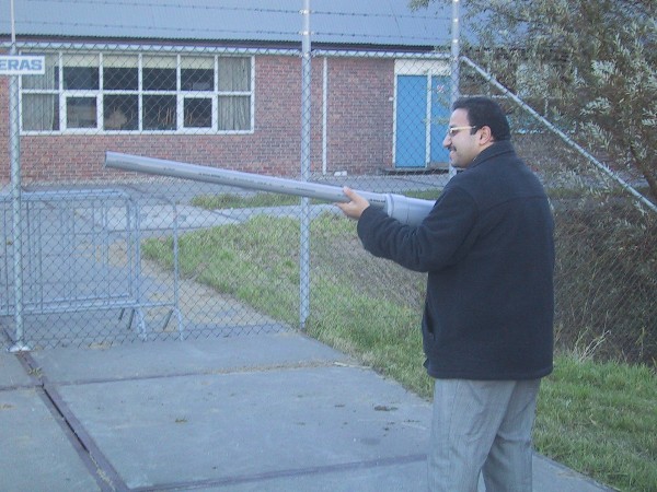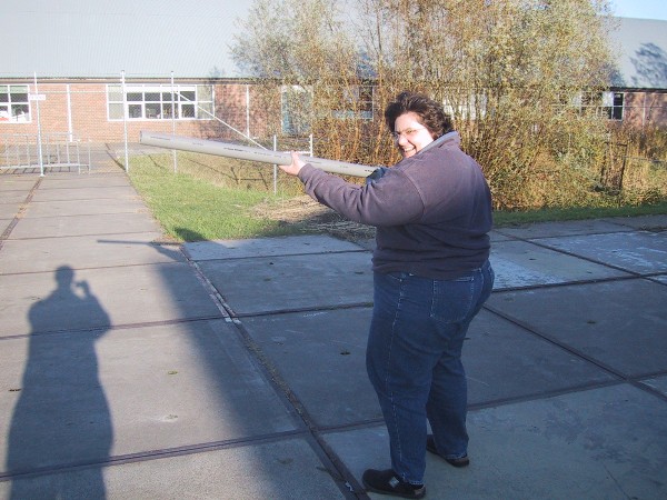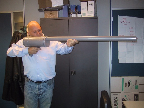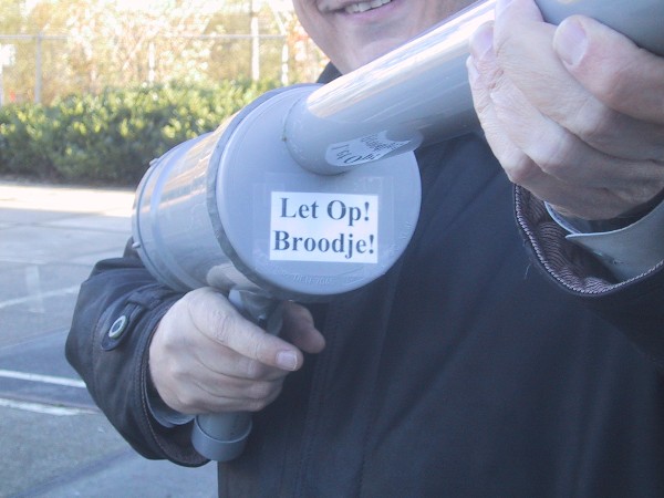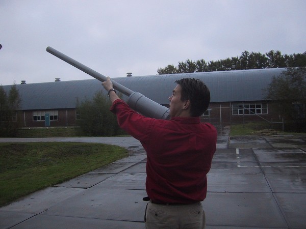 This brings back memories of his days in the French Foreign Legion. Note his comfort with firearms and the Uzi-toting stance. By this point we were out of broodjes and had switched to hard boiled eggs. Results were inconclusive; the power depends heavily on how well the individual egg fits in the barrel. Omar's shot went clear over the canal and landed in the parking lot of the hanger, but that was the best we did with eggs.