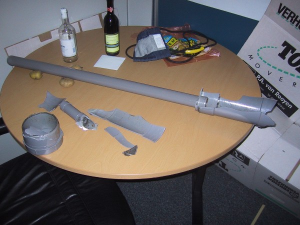 On a cold Amsterdam night, the LBA shattered into quite a few pieces. Here the shrapnel is assembled on a table for inspection. Luckily nobody was injured. Note the water balloon cannon in the background. Rembrandtplein had no warning for what came next.
