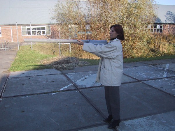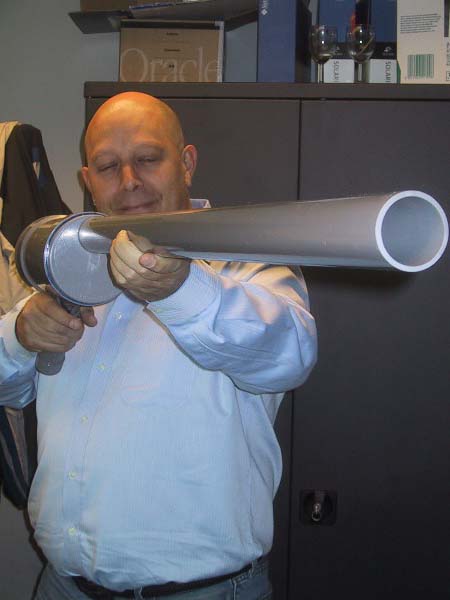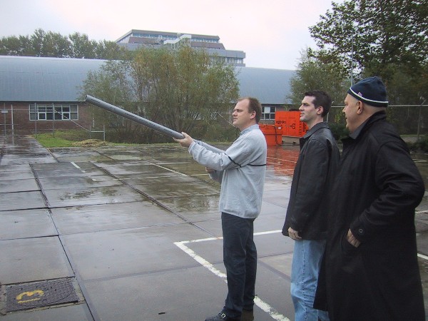This brings back memories of his days in the French Foreign Legion. Note his comfort with firearms and the Uzi-toting stance. By this point we were out of broodjes and had switched to hard boiled eggs. Results were inconclusive; the power depends heavily on how well the individual egg fits in the barrel. Omar's shot went clear over the canal and landed in the parking lot of the hanger, but that was the best we did with eggs.